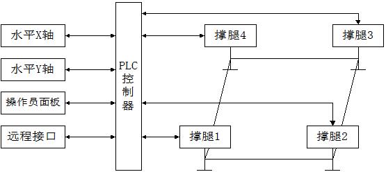 四腿机电式自动调平台主要由如下机构组成:一套控制系统箱、四只电动推杆、一套双轴水平检测器、一组连接电缆等。其中,可编程控制器PLC为控制系统核心;电动推杆及其控制器构成执行机构;双轴水平检测器、电动推杆限位开关组等组成反馈系统。